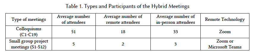 Hybrid meetings are video or audio-based communication sessions among co-located and remote participants.