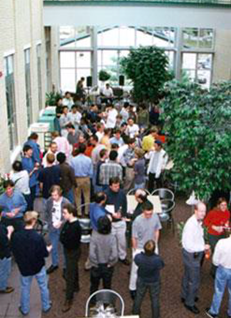 When people attend social gatherings or interact before/after meetings, they often talk in small groups, but 1) can overhear other groups, and 2) have the option to switch to another group conversation when desired.